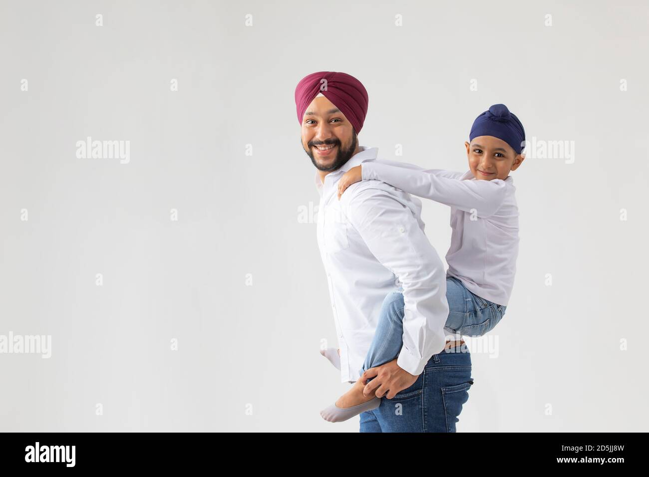 A SIKH FATHER SON DUO ENJOYING FREE TIME HAPPILY AND LOOKING AT